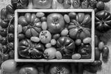 Fresh, raw and colorful tomatoes of different sizes and kinds in white wooden box