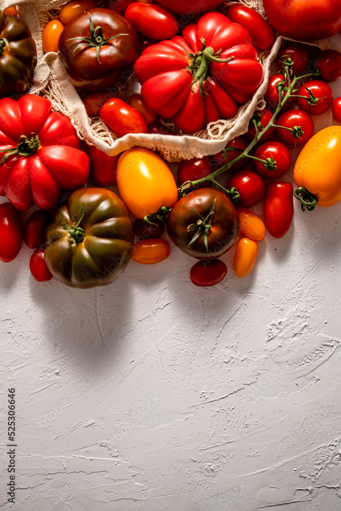 Fresh, raw and colorful tomatoes of different sizes and kinds in eco net bag