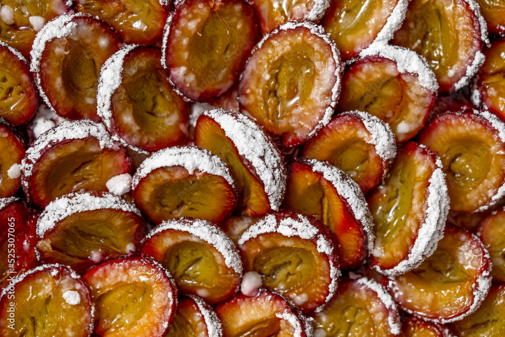 Tasty homemade pie or tart with plums and sugar powder. Close up shot