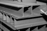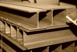 The stack of rolled metal is on the background of a green field, facing the steel profile.