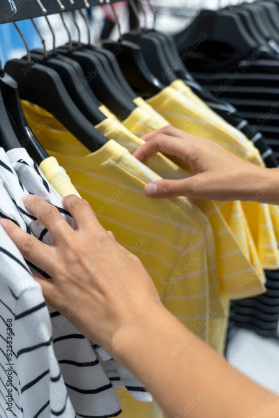women's hands are sorting through T-shirts hanging on a hanger in the store.