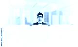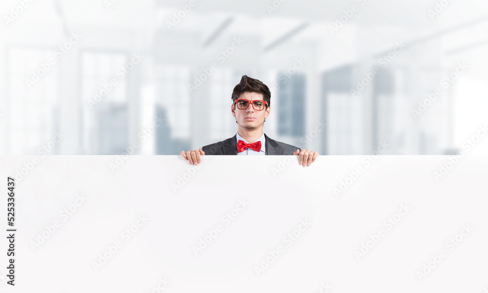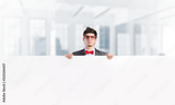 Young businessman holds a banner