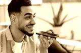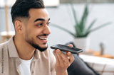 Speakerphone conversation. Close-up of excited positive indian or arabian man, sitting on a sofa in living room, holding his smartphone, talking on speakerphone and smiling, record voice message