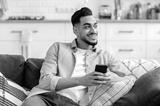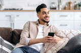 Online messaging. Positive indian or arabian guy in stylish wear, sit in a modern living room on comfortable sofa, holding his smartphone, texting message, browsing social media, surfing web, smiling