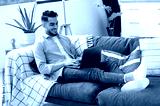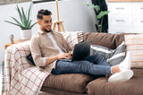 Positive arabian or indian young man in casual stylish clothes, freelancer, web designer, sitting on sofa in a living room, uses laptop for working on a project, elearning, browsing internet, smiling