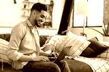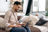 Glad positive arabian or indian young stylish modern man, spending time at home, sitting on sofa in living room, using laptop, browsing internet, social media, watching videos, smiling