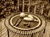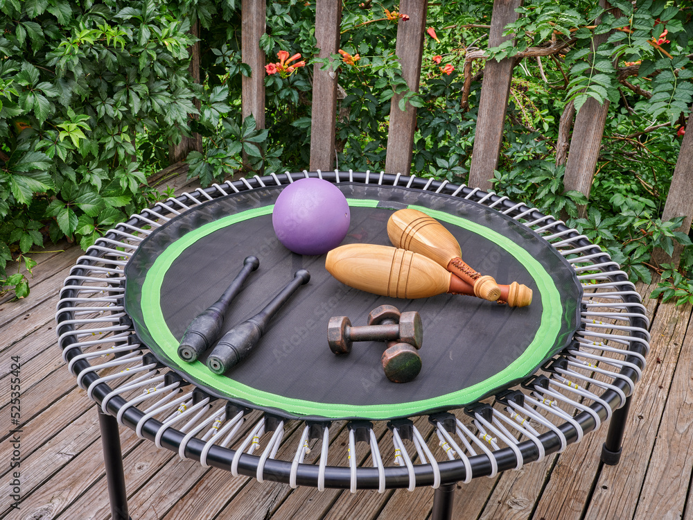 mini trampoline with Indian clubs a slam ball and dumbbells for fitness exercising and rebounding in a backyard patio