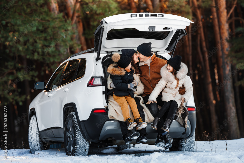 Happy young family having fun. People are sitting in the trunk of family car. Mom, dad and children are resting in the winter forest.