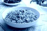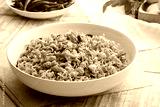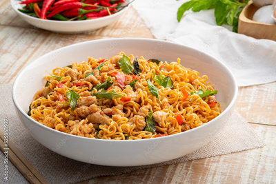 Spicy stir fried instant noodle with minced pork and holy basil leaves in white plate