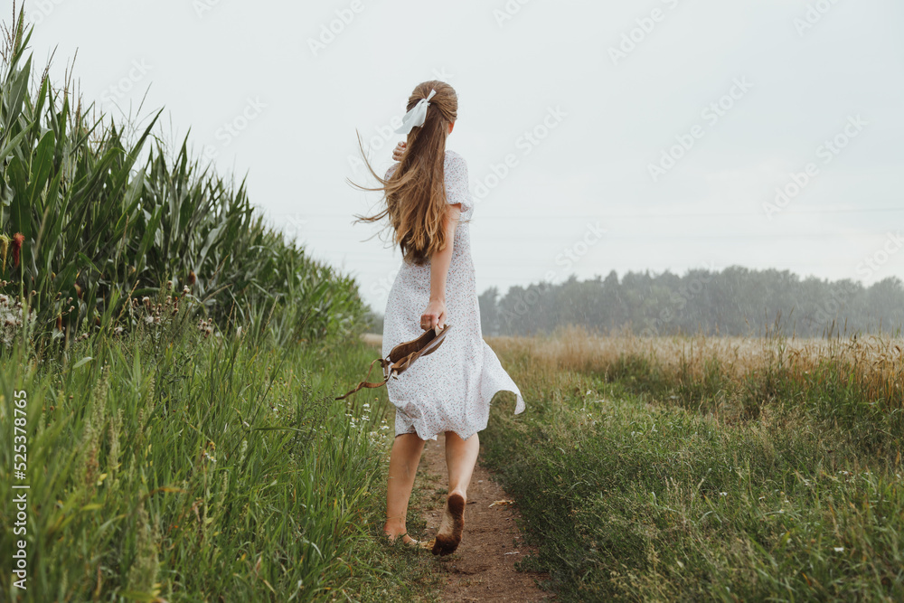Happy woman in summer dress with shoes in hands runs barefoot in rain along country road in field.