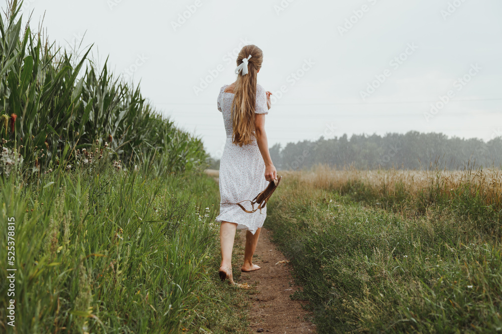 Happy woman in summer dress with shoes in hands runs barefoot in rain along country road in field.