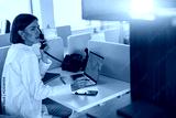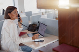 Busy woman worker talk phone with client sit on her workplace in office. Blurred background