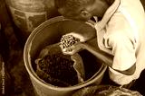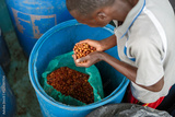 Top view of African Americam worker placing coffee beans in the bag into a plastic container at farm in Africa