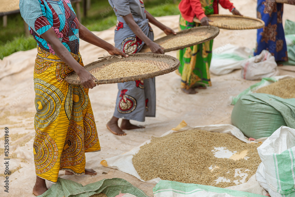 Cropped photo of female coffee farmers sorting through coffee cherries at farm in Africa