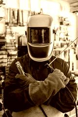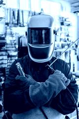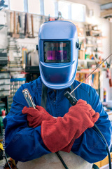 A man welder with safety helmet working with arc welding machine in the workshop
