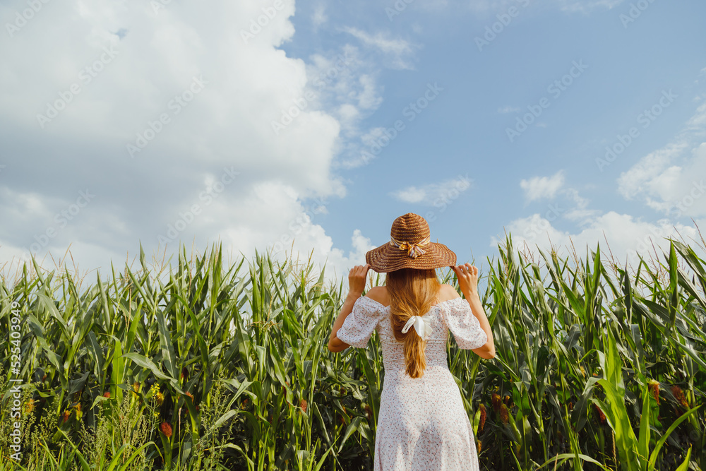 Woman in hat and dress in fresh corn cobs in field