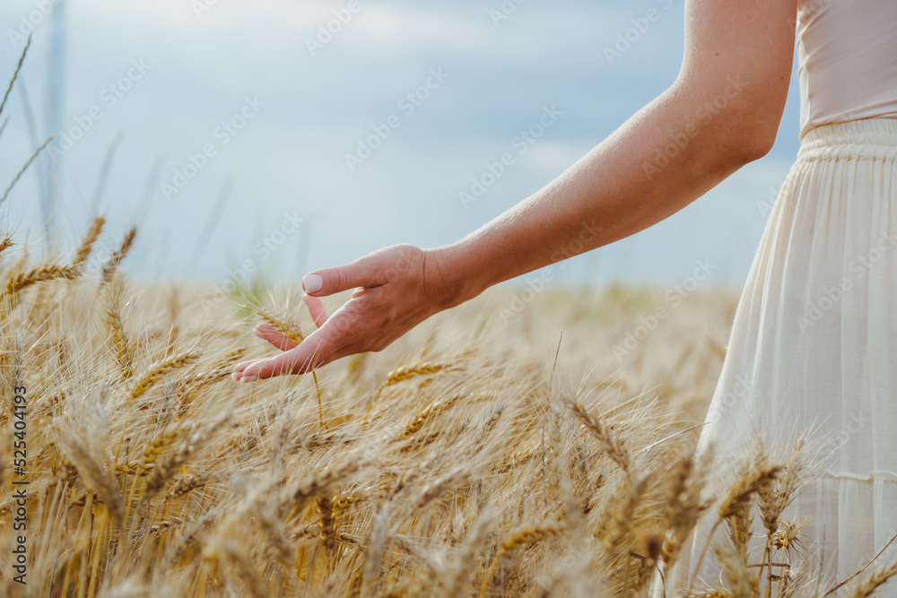 Close-up woman's hands carefully holds ears of wheat, rye in a wheat, rye field.