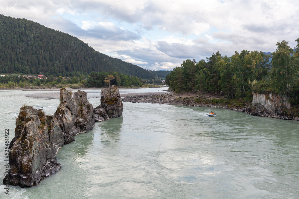 A fast-flowing wide and full-flowing mountain river. Large rocks stick out of the water. Big mountain river Katun, turquoise color, in the Altai Mountains, Altai Republic. Place the Dragon's Teeth.