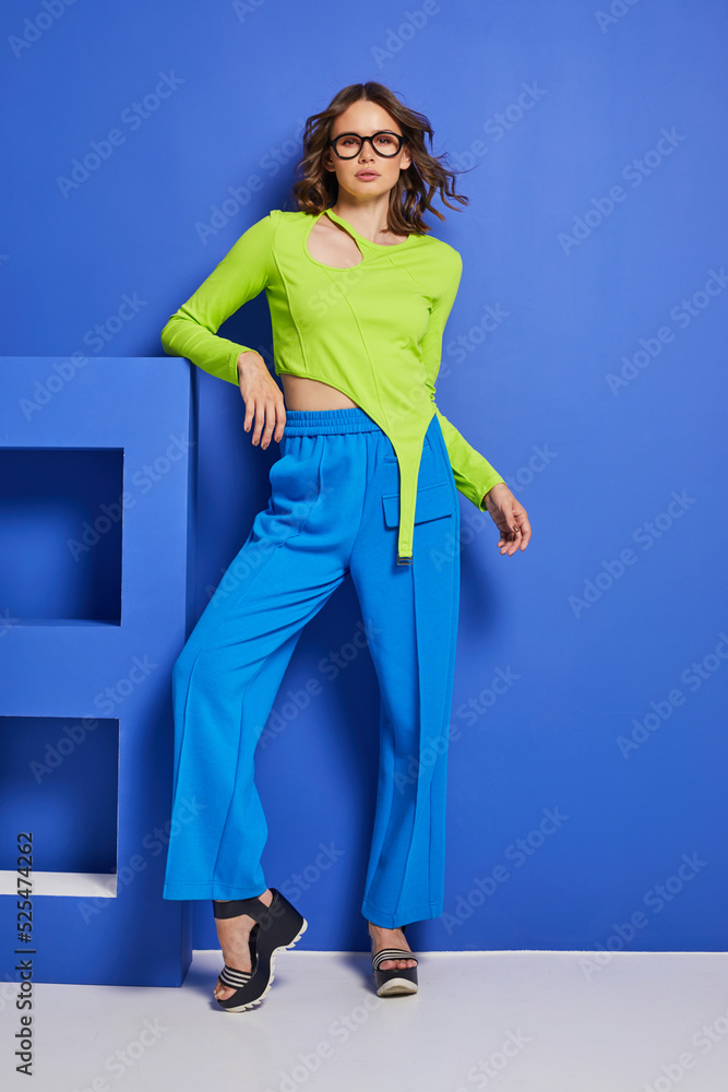 Fashion asian female model in green trendy top and blue pants.