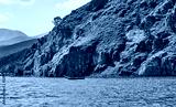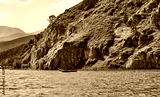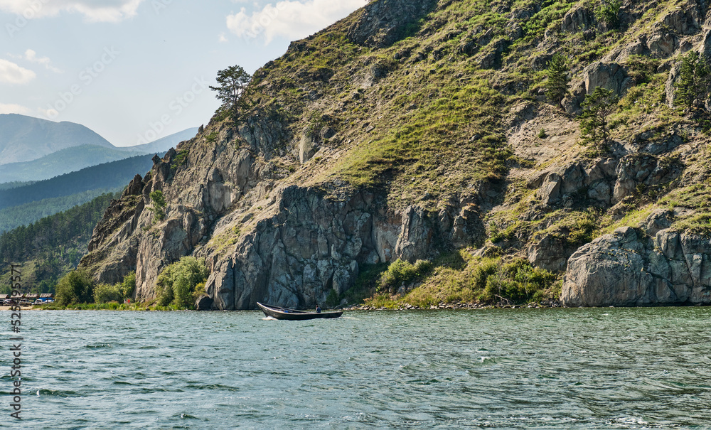 Man on fishing wooden longboat with motor moving to tent camp along cliff. Lake Baikal, Russia.