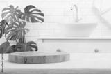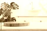 Round wooden podium for product display on blurred bathroom background