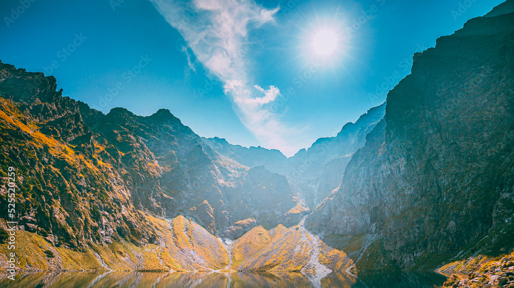 Tatra National Park, Poland. Calm Lake Czarny Staw Under Rysy And Summer Mountains Landscape. Sunshine With Sunrays Above Beautiful Scenic View Of Lake. UNESCO World Heritage Site. Polish Nature.