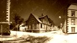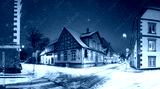 Parnu, Estonia. Night View Of Kuninga Street With Old Buildings, Wooden Houses, Restaurants, Cafe, Hotels And Shops In Winter Evening Night Illuminations.Altered starry night sky stars.