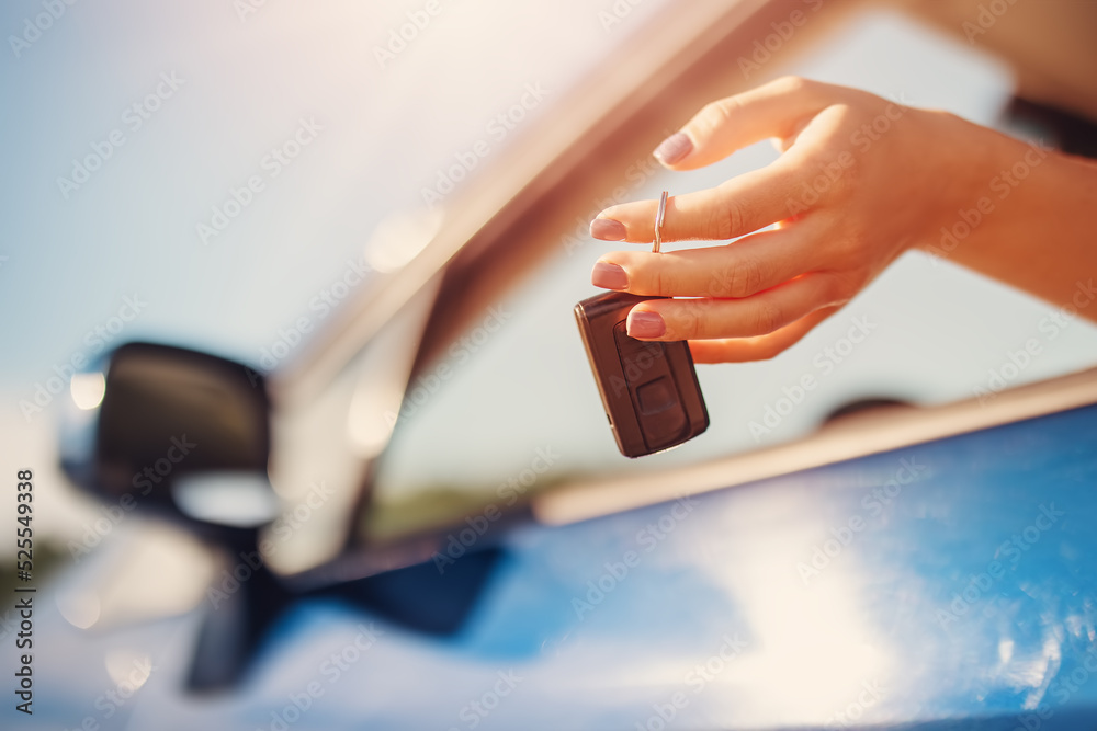 Woman's hand holding key from her new car