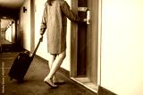 Cropped shot view of tourist woman pulling her luggage to her hotel room after check-in. Conceptual of travel and vacation.