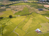 Aerial view of rice paddy field in Pua district a significant maize-growing area in Nan province of Thailand. Thailand has a strong tradition of rice production.