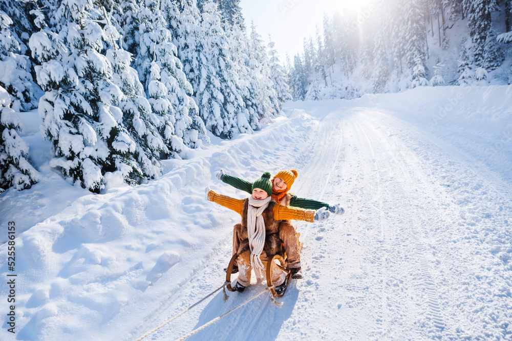 Happy funny children ride wooden retro sleds on snowy road in mountains. Family on winter walk.