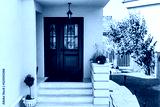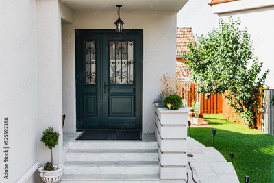 The front side of a home with a green wooden door and white stairs next to terrace with grass. A lamp is hanging in front of the door and patio is decorated with a small tree in a pot