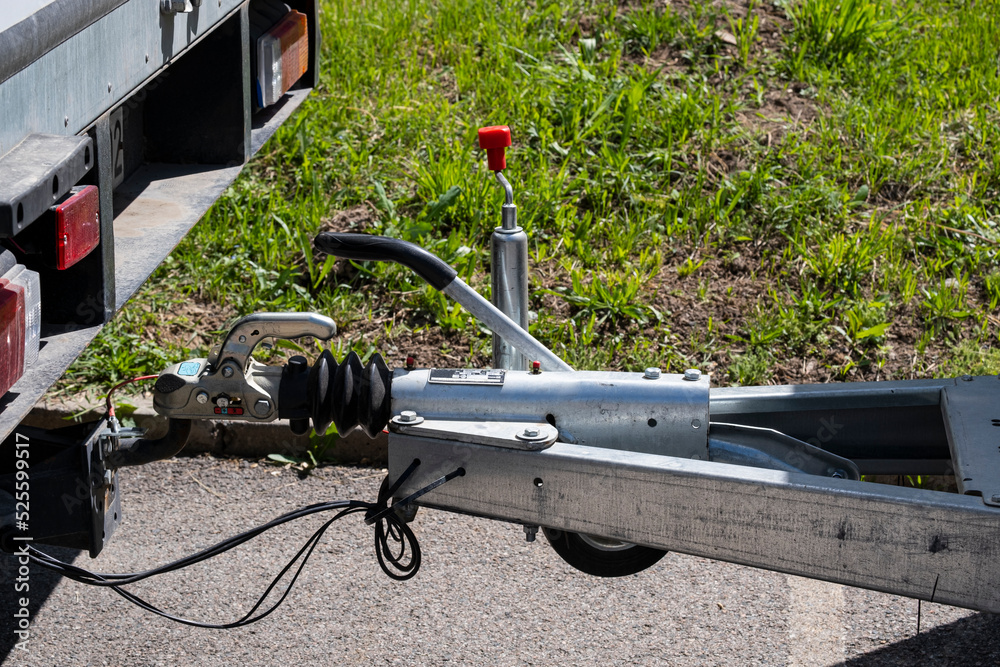 Trailer attachment system. Trailer lock on the background of asphalt.