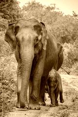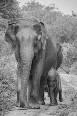 Vertical shot of an Elephant walking with its calf on a dirt road in the jungle