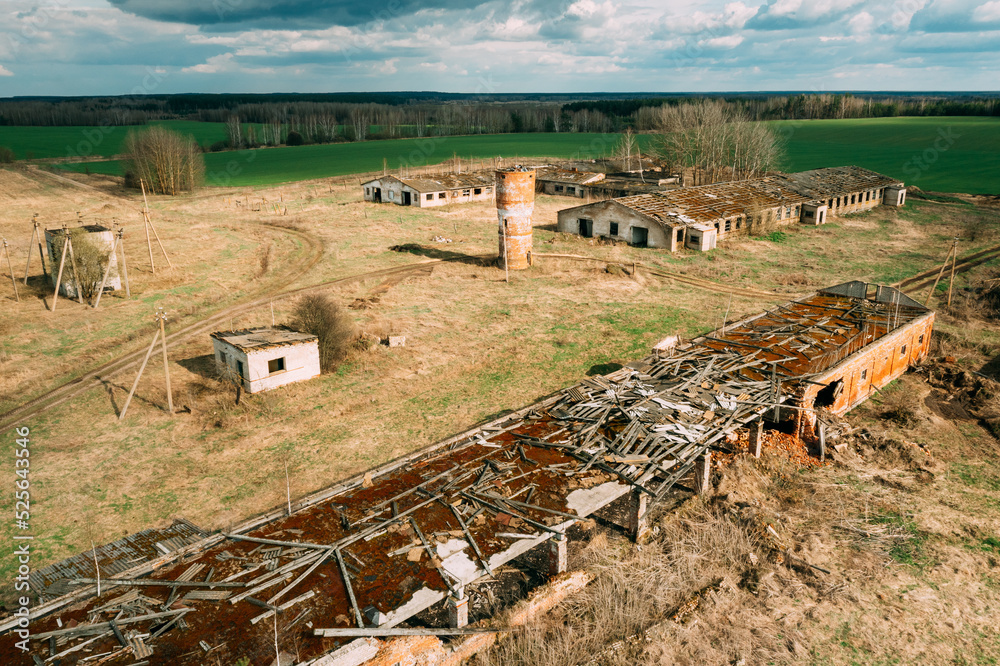 Belarus. Abandoned Barn, Shed, Cowsheds, Farm House In Chernobyl Resettlement Zone. Chornobyl Catastrophe Disasters. Dilapidated House In Belarusian Village. Whole Villages Must Be Disposed.