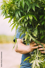 Man Holding Heap Bunch Legal Green Marijuana Cannabis Sprout In His Hands. Cannabis Beautiful Marijuana Cannabis Plant. Close Up.