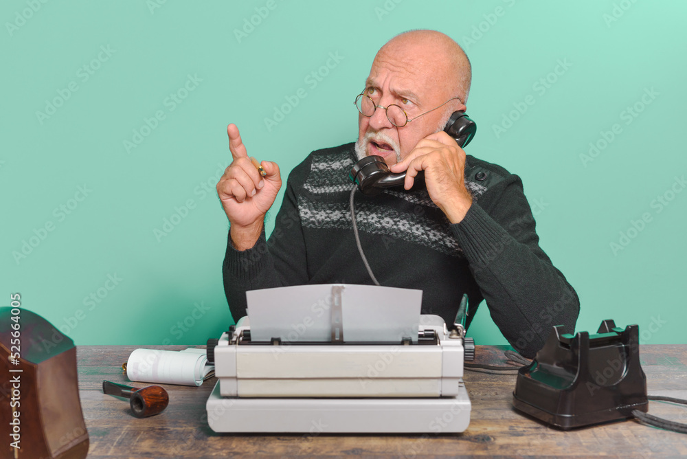 Journal or newspaper editor of the past. Work desk, typewriter and phone