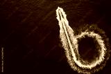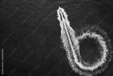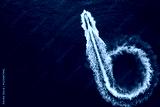 Aerial top view of a motor powerboat forming a circle of waves and bubbles with its engines over the blue sea