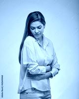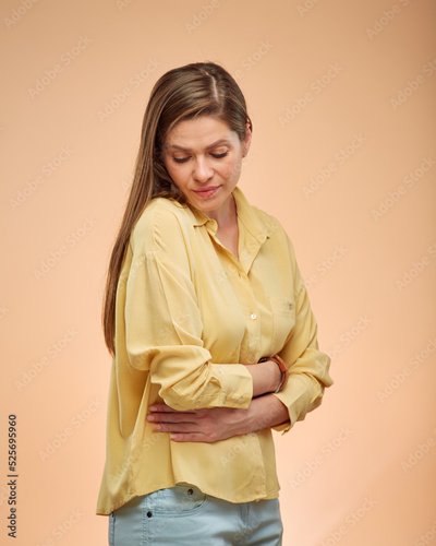 Woman with abdominal pain holding hand on stomach and looking down, isolated portrat on studio yellow background.