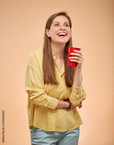 Smiling woman looking up, isolated portrait on yellow background. Young lady with long hair holding red coffee cup.