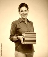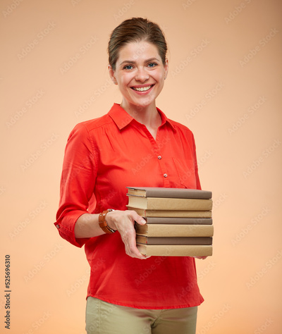 Isolated portrait of smiling teacher or student woman holding stack of book.