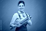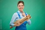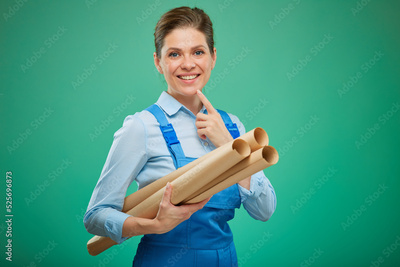 Thinking woman worker or student in overalls holding blueprint. Isolated portrait on green.