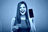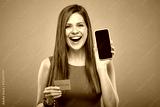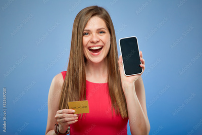 Smiling happy woman in red dress holding credit card and smartphone. Isolated female person portrait on blue background.