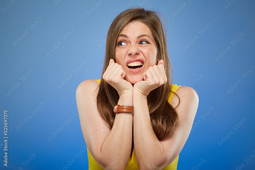 Shocked woman with disgust emotion. Isolated female portrait on blue background.