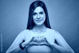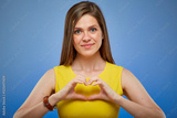 Woman smiling and doing heart gesture with fingers. Isolated female portrait on blue background.