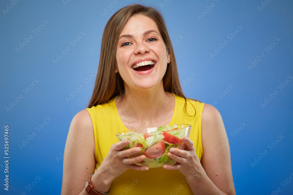 Laughing young lady in yellow dress holding glass bowl with salad. isolated female portrait.