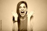 Emotional woman isolated portrait on yellow brown background. Mouth open.