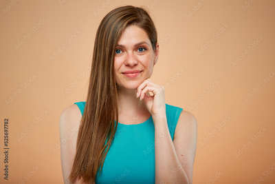 Smiling woman with long hair wearing blue dress isolated portrait on yellow brown background.