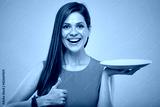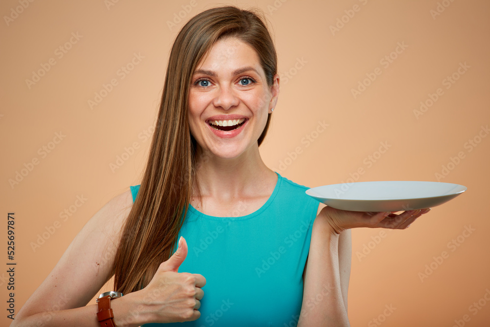 Young lady in green dress holding empty plate and shows thumb up, isolated on peach color background