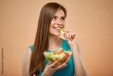 Smiling woman eating salad from bowl, isolated portrait on yellow brown background.